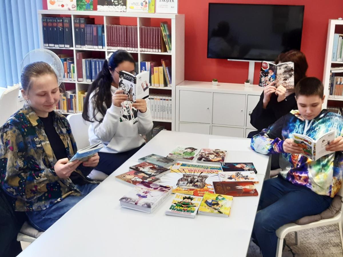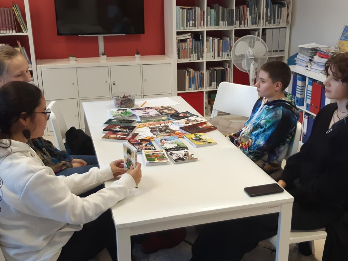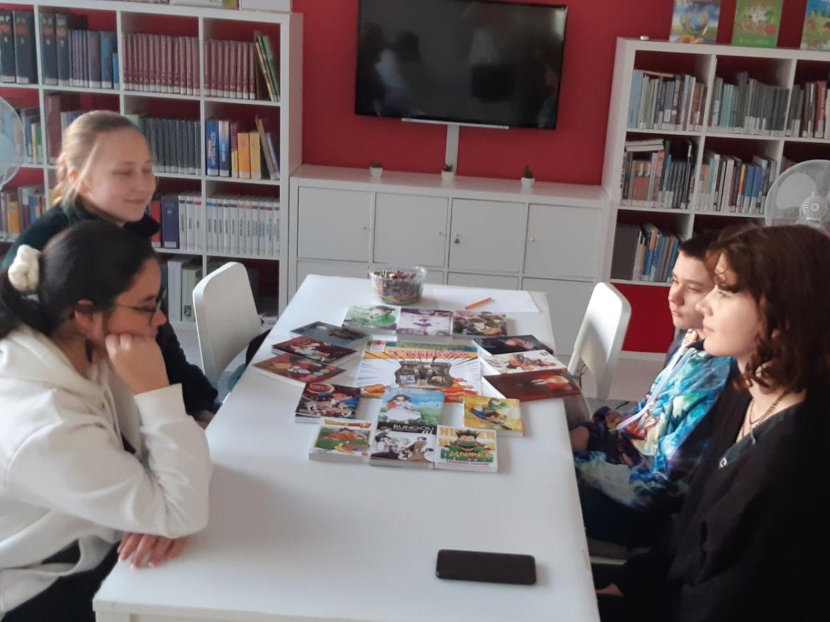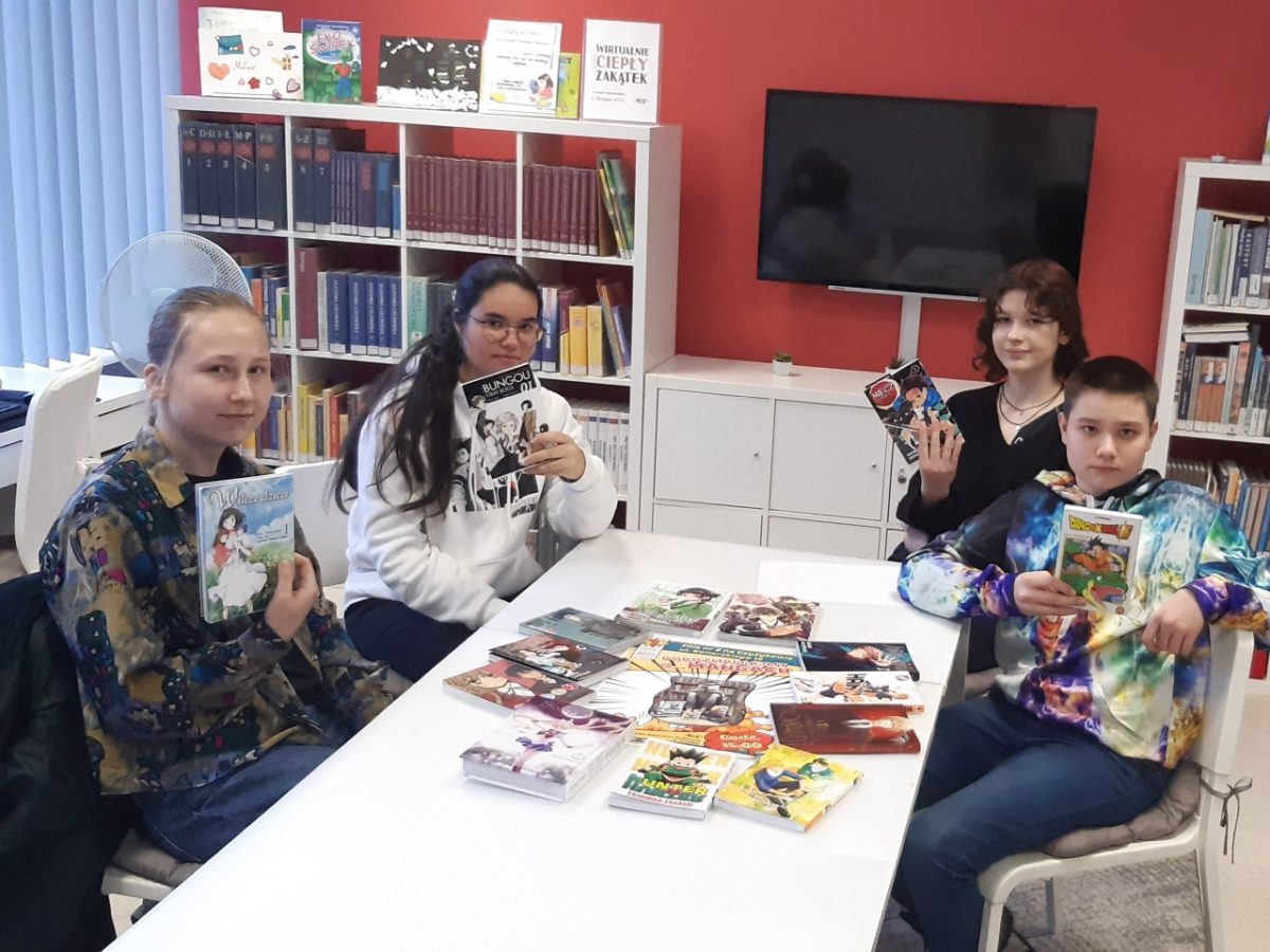 Podczas spotkania młodzież opowiadała, jak zaczęła się ich przygoda z mangami, czy warto je czytać (oczywiście, że tak – są ciekawe, a do tego pięknie narysowane – przynajmniej większość) I czy czytanie od tyłu nie sprawia im trudności (absolutnie nie). Zrobiliśmy mały przegląd mang – które są najciekawsze, najdłużej wychodzą, które uczestnicy spotkania polecają. Porozmawialiśmy również o anime – czyli ekranowych odpowiednikach mang. Przy okazji pojawił się odwieczny dylemat – najpierw książka potem film? Okazało się, że czasami było odwrotnie – zaczęło się od anime, a potem dopiero były mangi.